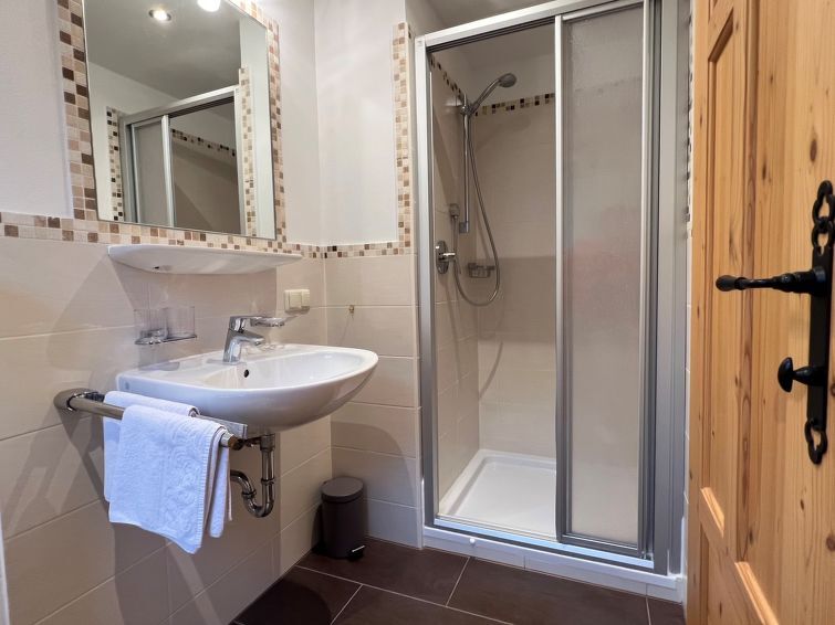 "Glanzern", appartement 4-kamers 100 m2, op de bovenverdieping. Mooi en rustiek ingericht: woon-/eetkamer met 1 slaapplaats (90 cm, lengte 200 cm), Flatscreen TV. Uitgang naar het balkon. 3 2-pers. kamers, elke kamer heeft 1 2-pers bed (180 cm, lengte 200 cm), douche/WC. Open keuken (oven, afwasmachine, 4 keramische glas kookplaten, diepvriezer) met eettafel. Aparte WC. Balkon 20 m2. Balkonmeubilair. Mooi panoramazicht op de bergen en het landschap. Parkeerplaats. Niet rokers woning.