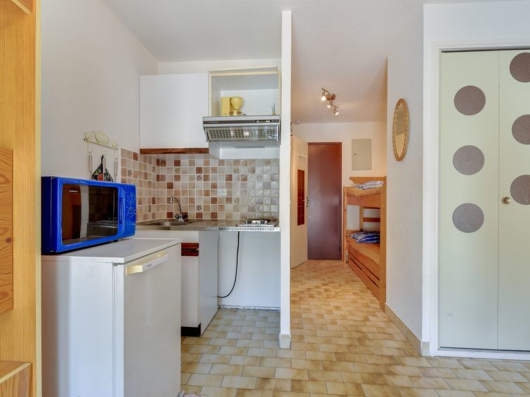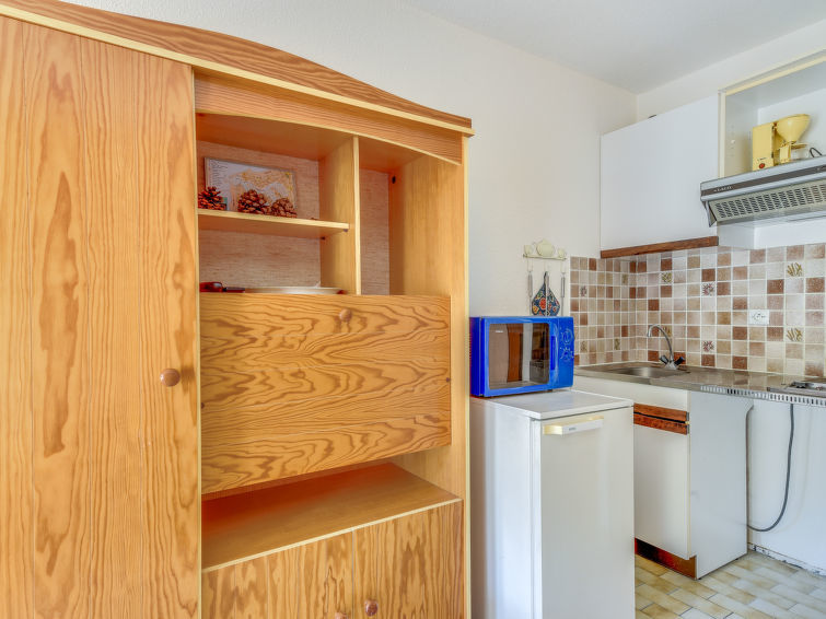 Studio 1-kamer 25 m2 op de 1e verdieping. Het objekt is geschikt voor 2 volwassenen + 2 kinderen. Woon-/eetkamer met 1 2-pers divanbed (140 cm, lengte 190 cm), TV (Flatscreen TV). Uitgang naar het terras. Cabine met 1 x 2 stapelbedden (90 cm, lengte 190 cm). Kookhoek (2-pits kookplaat, magnetron, elektrische koffiemachine). Zitbad/WC. Klein terras. Terrasmeubelen. Ter beschikking: Internet (Internet (WiFi), extra). Geschikt voor families. Geen parkeerplaats. Rookmelders. In plaats van een afgesloten slaapkamer bevinden sommige slaapgedeeltes zich in een open ruimte (galerij, nis, etc.).