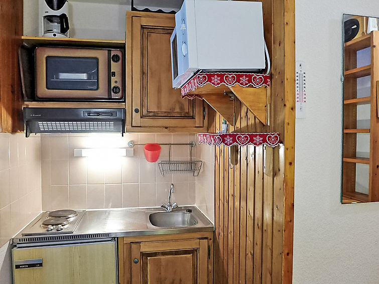 Appartement 1-kamer 21 m2, op de begane grond. Eenvoudig ingericht: woon-/eetkamer met 1 divanbed en 1 x 2 stapelbedden, TV. Uitgang naar het balkon. Kookhoek (2-pits kookplaat, oven, waterkoker, magnetron, elektrische koffiemachine). Bad/WC. Elektrische verwarming. Balkon 4 m2, op het zuiden gelegen. Mooi uitzicht op de bergen. Ter beschikking: Internet (Internet (WiFi), extra). Hoogte 185 cm. Geen parkeerplaats. TV alleen FR. Rookmelders. 74056 001134 CF